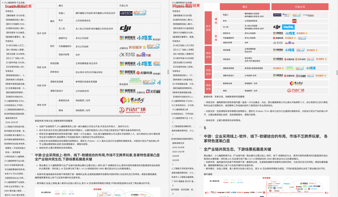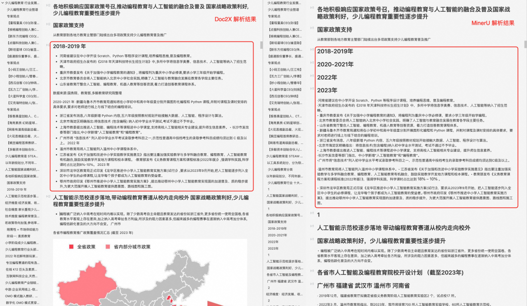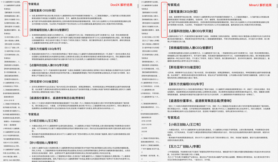 我还是拿《2024少儿编程教育行业发展趋势报告.pdf》这个文档进行解析,相比于 MinerU ,在以下几方面 Doc2X 做的更出色: