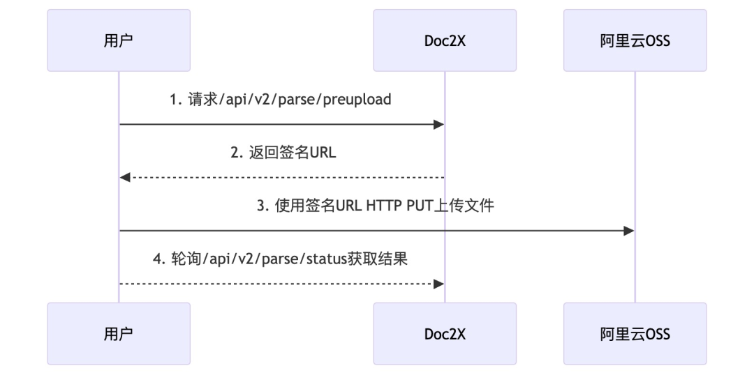 Doc2X RESTful API 的 Base URL 是 https://v2.doc2x.noedgeai.com,API 调用流程如下: