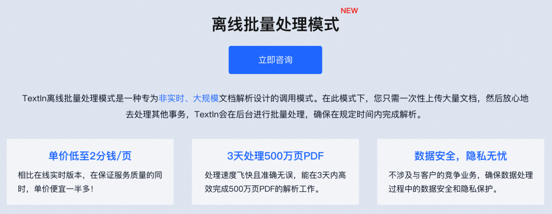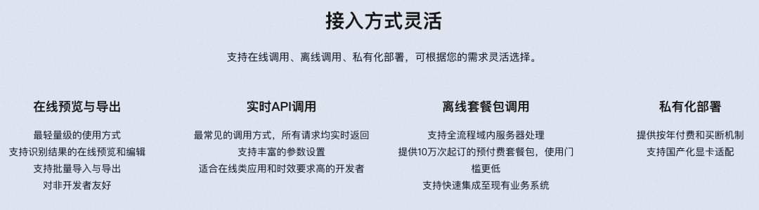 TextIn xParse提供了多种集成方式,支持在线预览与导出、实时API调用、离线调用以及私有化部署等方式,可根据您的需求灵活选择。