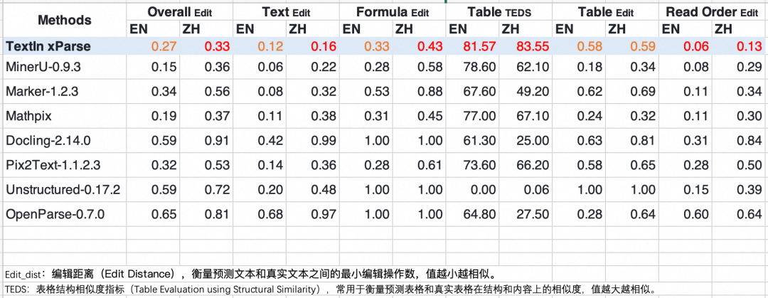 从整体(Overall Edit)来看,TextIn xParse不管是对英文文档(0.27)还是中文文档(0.33),都比大多数开源工具表现出色,由此可表明,TextIn xParse是一款能力较强且较为全面的文档解析工具。