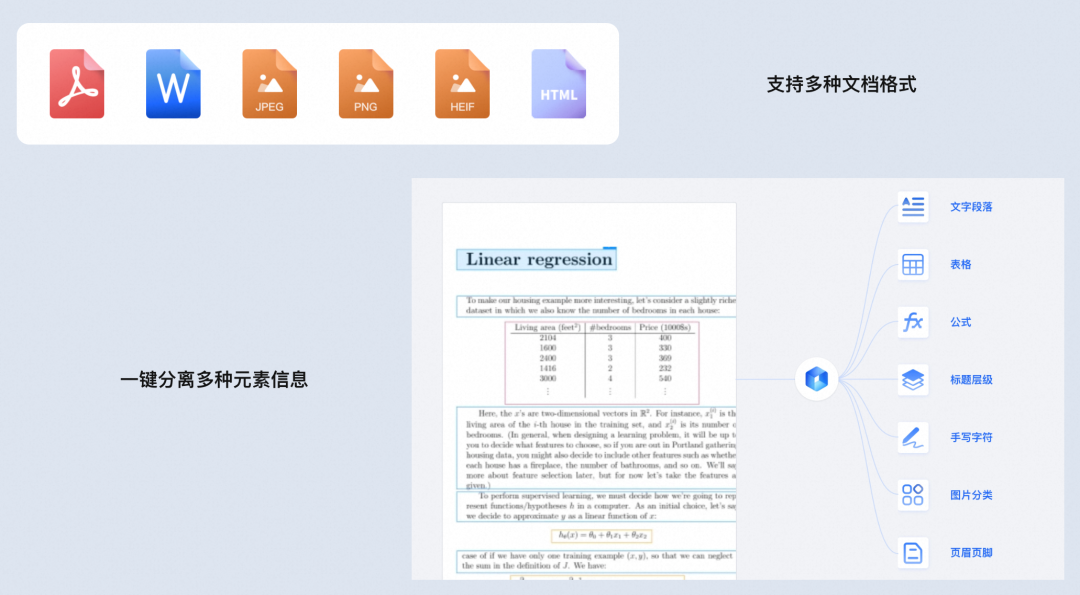 一个接口,支持PDF、Word(doc/docx)、常见图片(jpg/png/webp/tiff)、HTML等多种文件格式。一次请求,即可获取文字、表格、标题层级、公式、手写字符、图片信息。