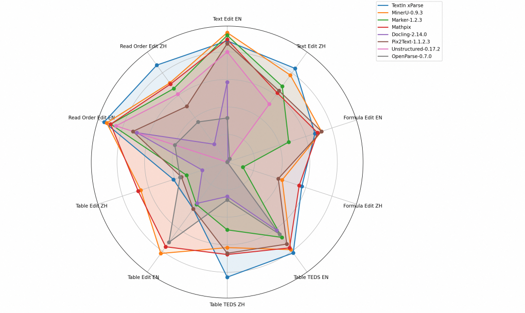 - • 文本(Text Edit):TextIn xParse不管是对英文文档(0.12)还是中文文档(0.16)都表现出色,尤其是对于中文文档表现得最好,表明其在处理纯文本内容时具有较高的准确性;