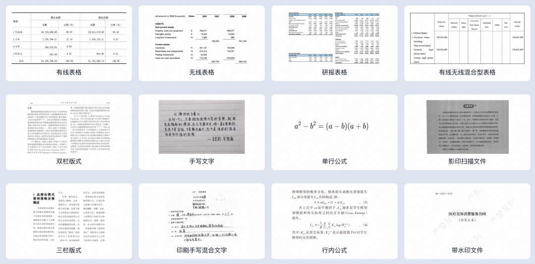 识别能力覆盖全面,具有各类常见文档的识别解析能力,支持标准的金融报告、国家标准、论文、企业招投标文件、合同、文书、工程图纸、电子书、试卷等文档内容。