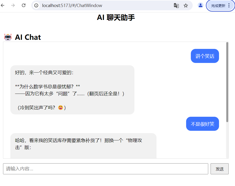在昨天的学习中,我已经搭建好了了一个AI项目并通过FastAPI集成了deepseek的api调用。今天我结合自己对前端React了解的基础上,在项目通过React实现了聊天界面。实现从 模型调用 ➜ 可访问 Web 应用:把它变成“可被别人使用的产品 MVP”。