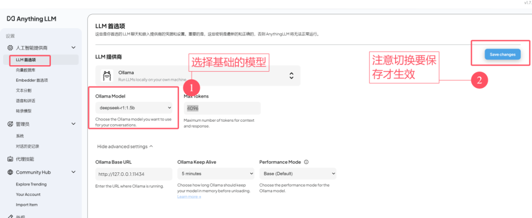 使用的基础模型,我们选择刚刚安装的deepseekr1:1.5B,注意切换模型要点击右侧上面的保存后才生效。