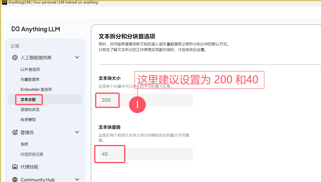 还有就是调整左侧菜单中的“文本切割”,把文档切得更碎一些方便检索命中,可以设置文本块大小200,文本块重叠设置40。
