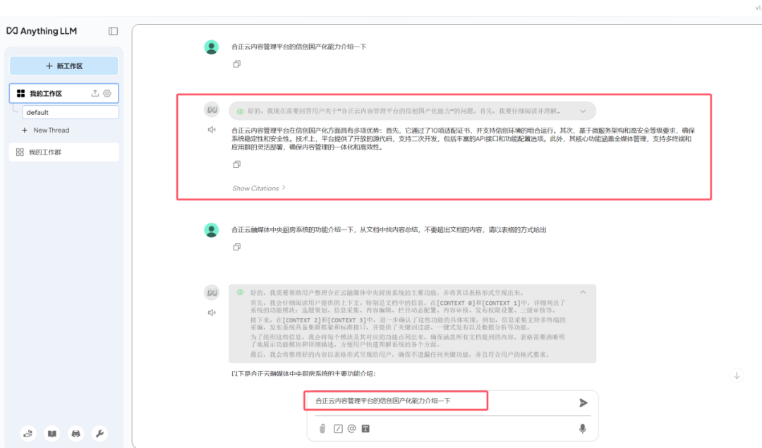 测试一下,我们输入“合正云内容管理平台的信创国产化能力介绍一下”,发现界面显示思考过程分析了刚上传的文件,并做出来有效总结输出,我们再输入“合正云融媒体中央厨房系统的功能介绍一下,从文档中找内容总结,不要超出文档的内容,请以表格的方式给出”发现也能比较好地输出内容来自另外一个文档中,效果还不错,其他的一些功能可以自己尝试用一下。