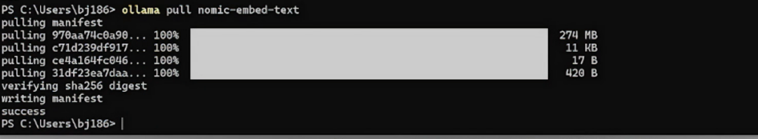 提示如下显示安装成功,因为是向量模型下载成功不会进入对话界面。