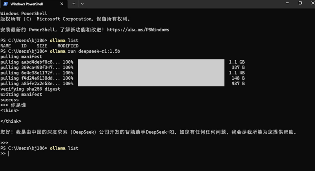 下载并运行deepseek-r1:1.5b,根据网络情况会下载一段时间,下载成功后进入如下: