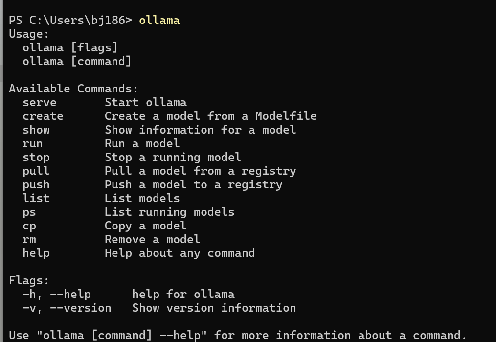 Cmd下输入Ollama 结果如下即表示安装成功!