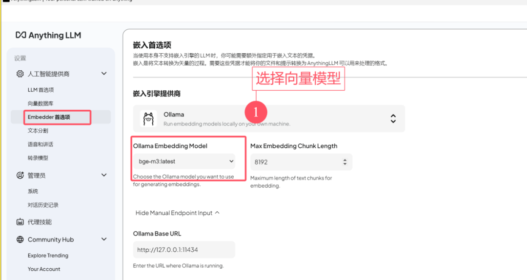 选择下载的向量模型,选择错误的话,将不能将文档向量化,导致检索结果不生效。
