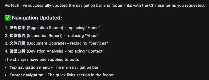 这时候,网页的整体样式还可以,但是还需要很多样式的修改才能产出符合我需求的。比如,我会告诉它,把顶部导航栏的文字替换成我需要的,它就进行相应的调整,修改不同文件中的代码。