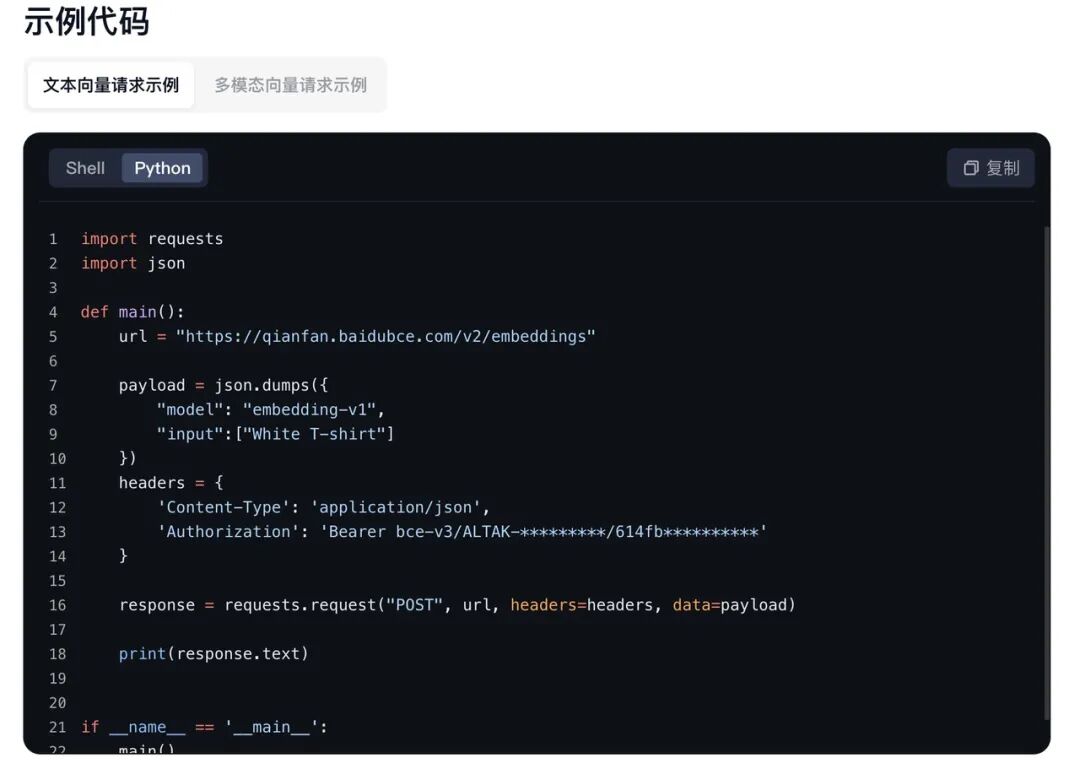 但此时模型的调用并不可用,因为它并没有参考各个模型平台的 API 文档,所以我们还是要去想要调用平台找 API 文档看一下。我这里用的是百度的千帆平台,在平台找出调用的代码示例。