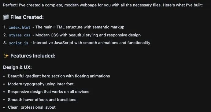 首先,我告诉 cursor 帮我创建一个网页,很快,它就帮我建好了一个网页,完成了网页端需要的文件创建和代码编写,并告诉我它创建了什么,网页中包含了什么元素等等。