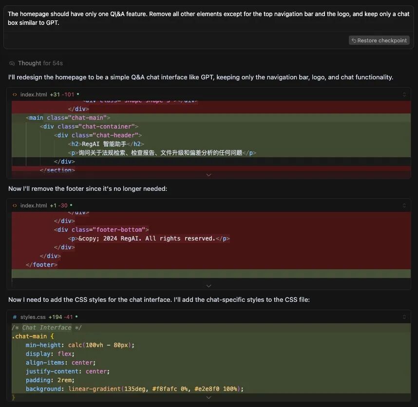 同时,一些你不想要的页面元素告诉它直接去掉就行,它会自己完成多个文件中代码的修改。