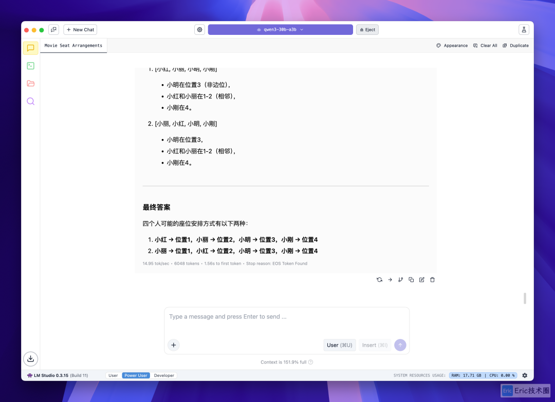 总结:对于逻辑推理相关的问题,在默认开启thingking模式的情况下,思考时间有些长,需要等待较长的时间,在我的观察下,思考过程中会快速的得出了正确答案,但是模型会在其中一直否定自己,花费更长时间进行验证,最后总体的思考时间较长。同时每个问题需要新开一个窗口,会出现之前已回答问题一起思考的情况。