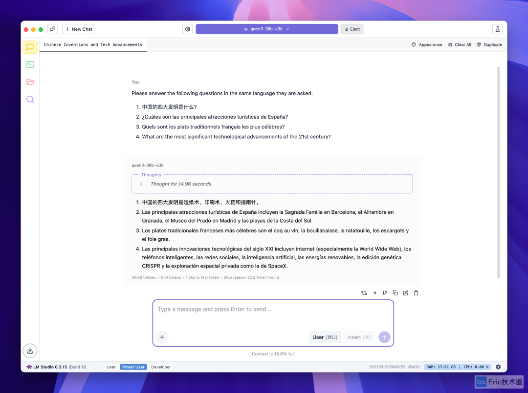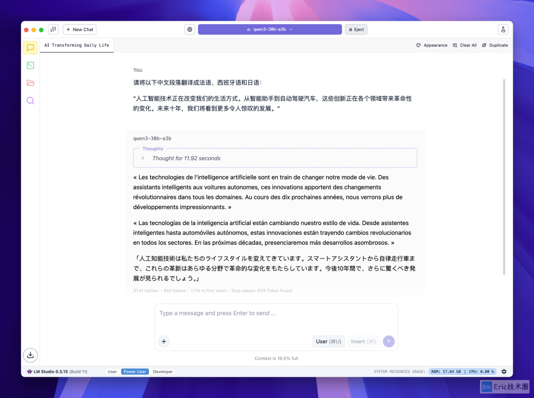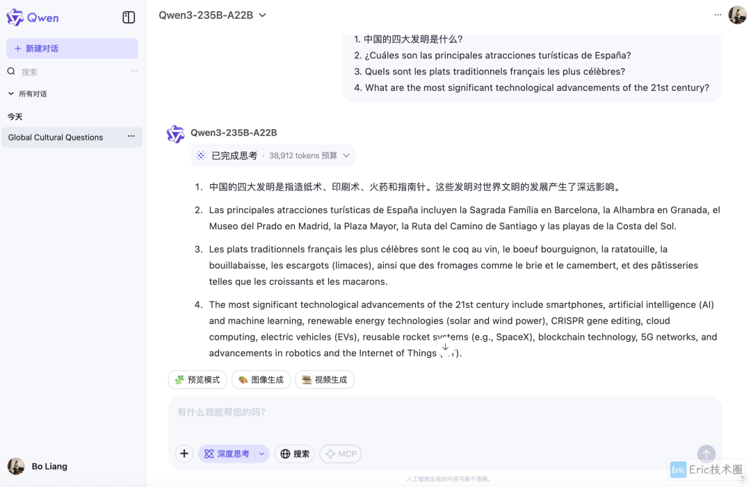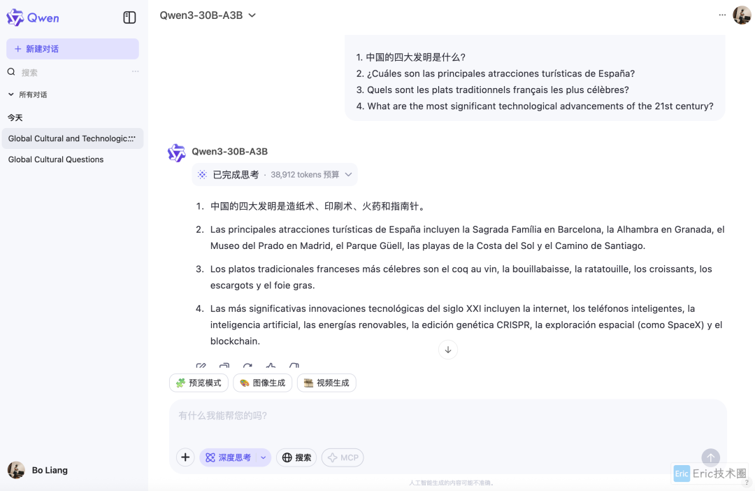 - 利用多语言能力:Qwen3支持119种语言,可以直接用多种语言提问或要求模型进行多语言翻译,无需切换模型。