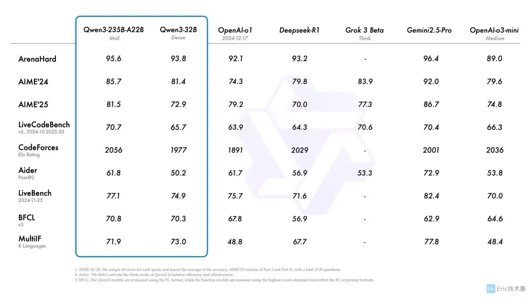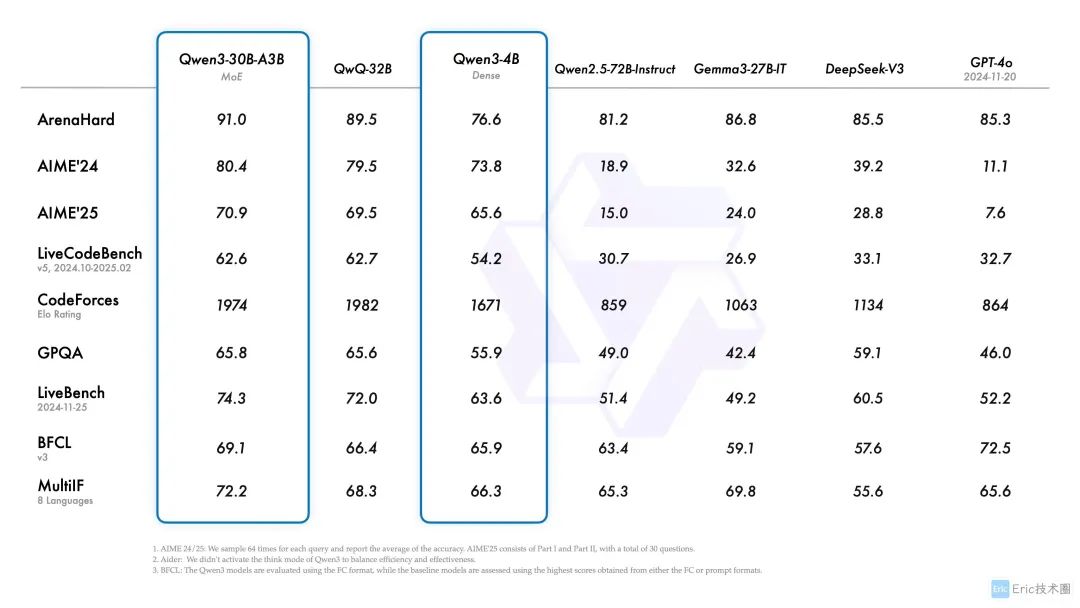 它的旗舰模型 Qwen3-235B-A22B 在代码、数学、通用能力等基准测试中,与 DeepSeek-R1、o1、o3-mini、Grok-3 和 Gemini-2.5-Pro 等顶级模型相比,表现出极具竞争力的结果。此外,小型 MoE 模型 Qwen3-30B-A3B 的激活参数数量是 QwQ-32B 的 10%,表现更胜一筹,甚至像 Qwen3-4B 这样的小模型也能匹敌 Qwen2.5-72B-Instruct 的性能。