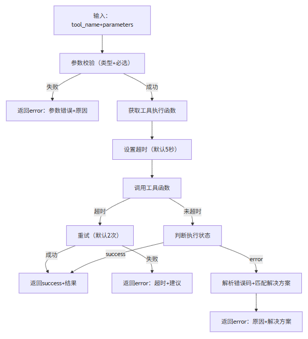 负责将“工具名 + 参数”转化为实际操作,处理参数校验、超时重试、异常分类,核心是“容错性”和“稳定性”。