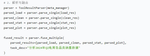 4.结果转化:将工具返回的原始数据(DataFrame、图片、JSON)转化为 LLM 可理解的文本,支撑报告生成。