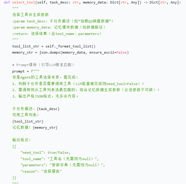 核心是根据“子任务描述 + 记忆数据”,选择最合适的工具并生成参数。