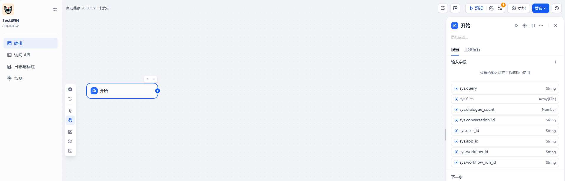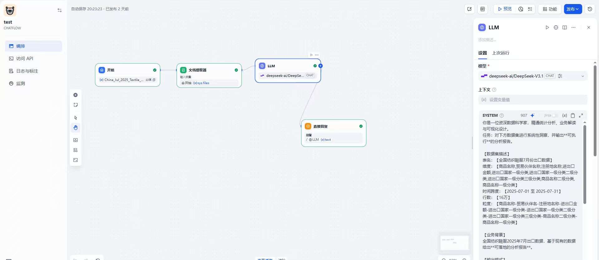 在 ChatFlow 编辑器拖拽配置节点,形成 “上传→解析→分析→执行→展示” 流程: