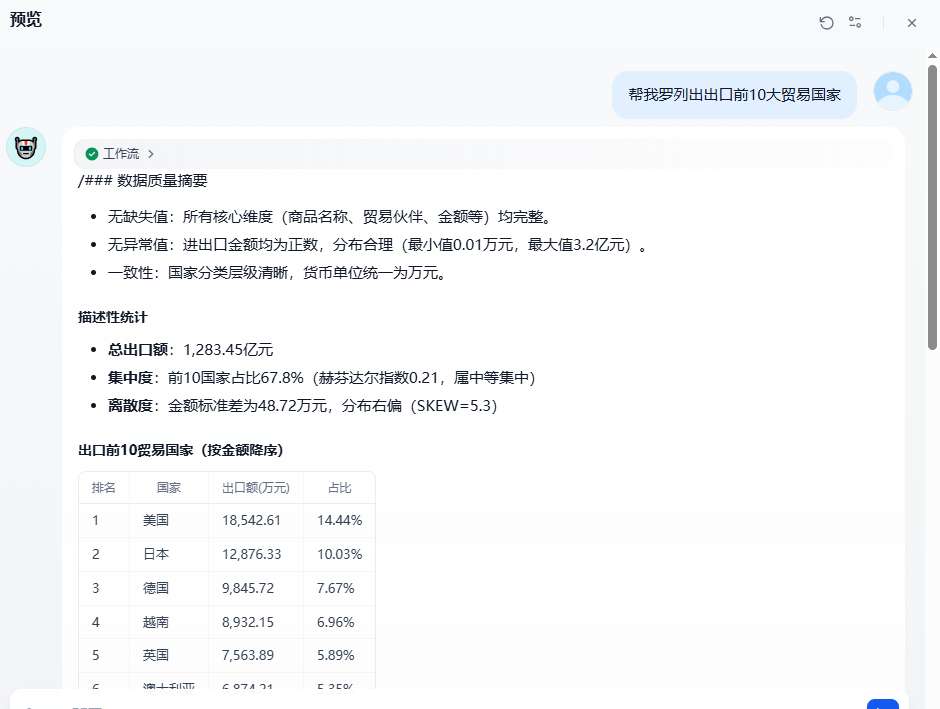 **提前预设分析模板**:针对分析的场景,设计模板流程(如 “月度出口金额分析” 自动计算各个国家的出口金额、增长率),用户一键触发。