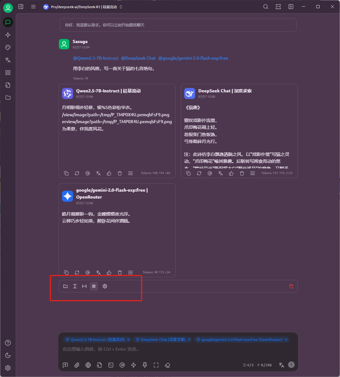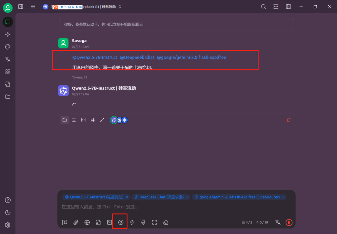 通过使用对话框下沿的@按钮,你可以选择任意多个模型,对同一段Prompt进行测试。