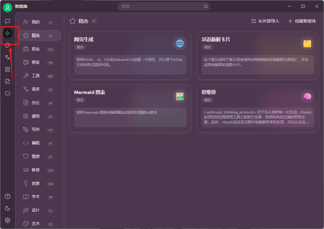 在Cherry Studio中,点击侧面栏智能体按钮,就能进入助手广场的界面。