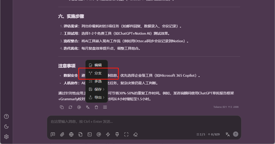 当我们想要对模型的回复从不同的角度追问时,为了防止上下文因内容过于复杂而被污染,我们可以先利用Cherry Studio提供的分支功能,”复制”出一个既有上下文完全相同的对话(即Cherry Studio中 的话题)。