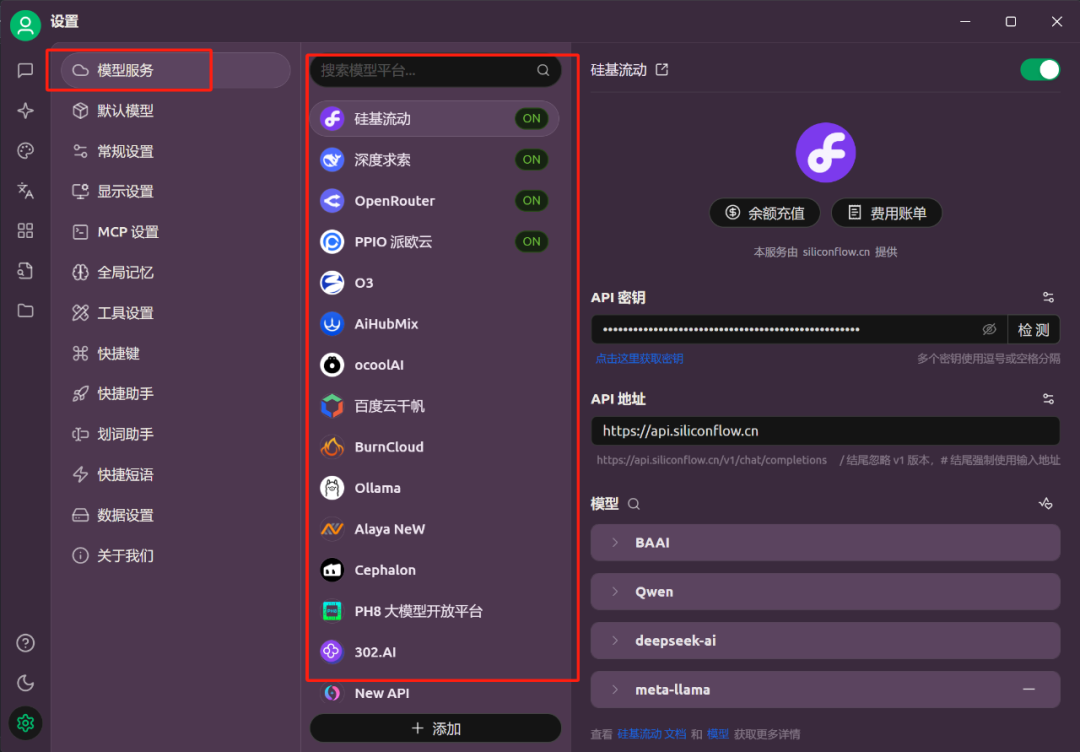 Cherry Studio本身允许我们进行非常自由的模型API配置,无论是通过深度求索、月之暗面之类的模型厂商,还是硅基流动、OpenRouter之类的模型批发平台,甚至通过本地Ollama,我们都能比较便利地使用我们需要的模型。