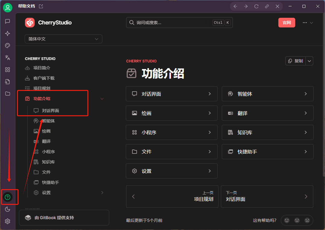 对Cherry Studio还比较陌生的朋友,建议先浏览官方帮助文档(点击软件主界面左下角小问号即可)中的功能介绍等相关部分,以熟悉基本操作。