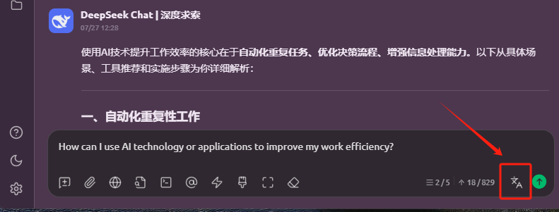 对于有些国外的模型,可能将Promt翻译为英文会有更好的效果。在Cherry Studio中,只需要按一下对话框右下角的翻译按钮,就能将你已写入的提示词翻译为英文。