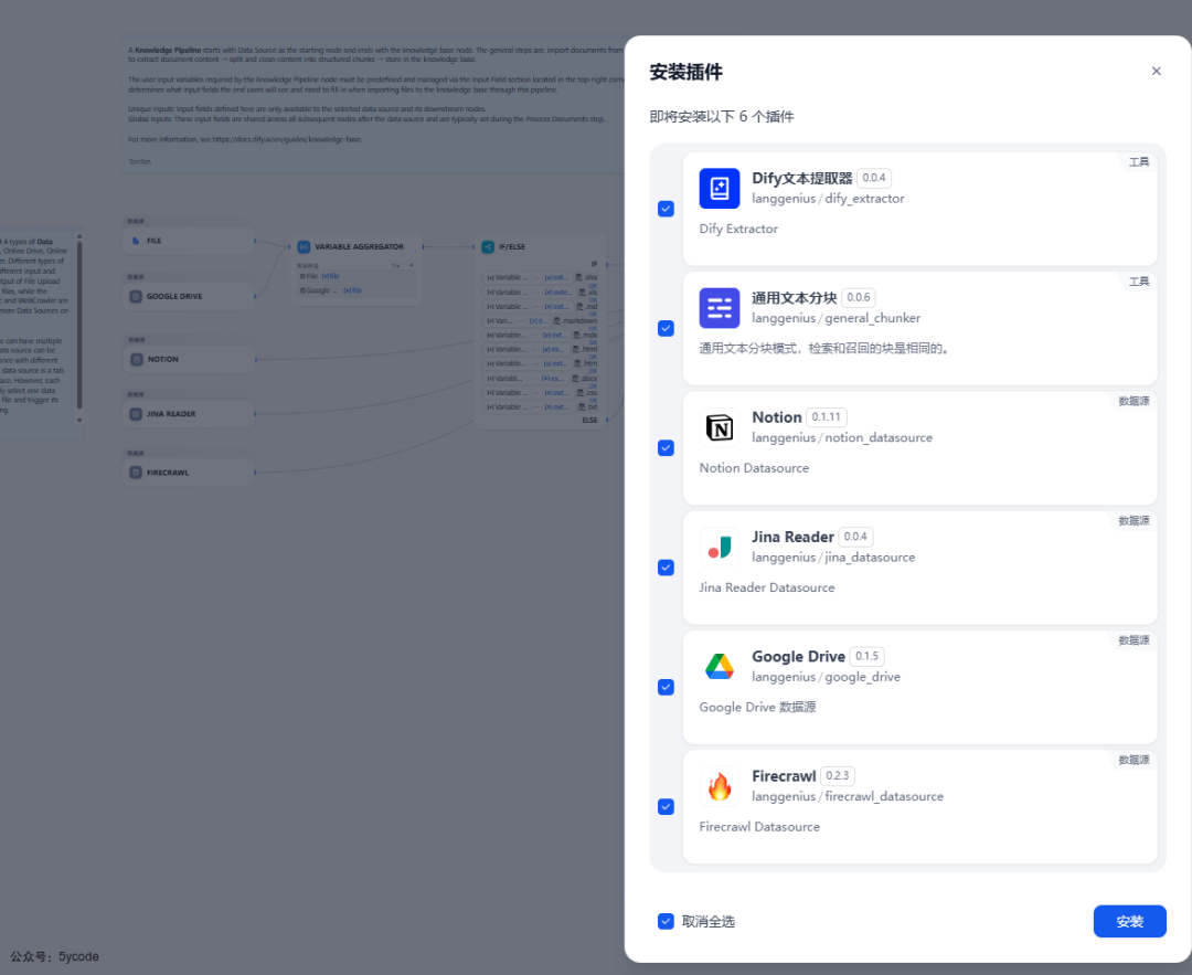 在知识管道里,点击空白右键,添加节点,在面板中有数据源的选项,这个是和现有工作流的差异。