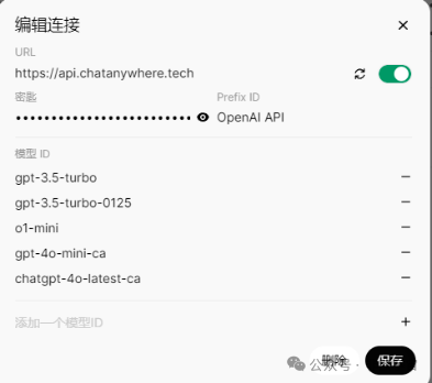 收费版参数如下:Prefix ID(提供商名称)为“OpenAI API”,URL为“https://api.chatanywhere.tech”,密钥为“sk-***********”。点击保存。