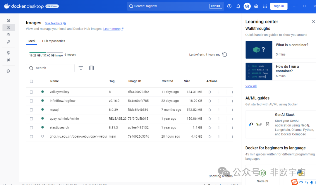 两个镜像下载完成后。可以看到Open-WebUI是4.46GB,而RAGFlow由好几个镜像组成,总计20GB左右。其他必要镜像后续再下载。