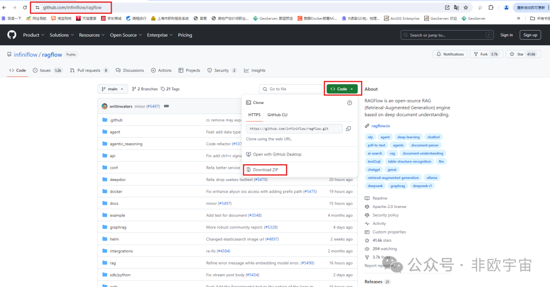 点击进入“https://github.com/infiniflow/ragflow”。Code选择Download ZIP。并解压至本地文件夹。