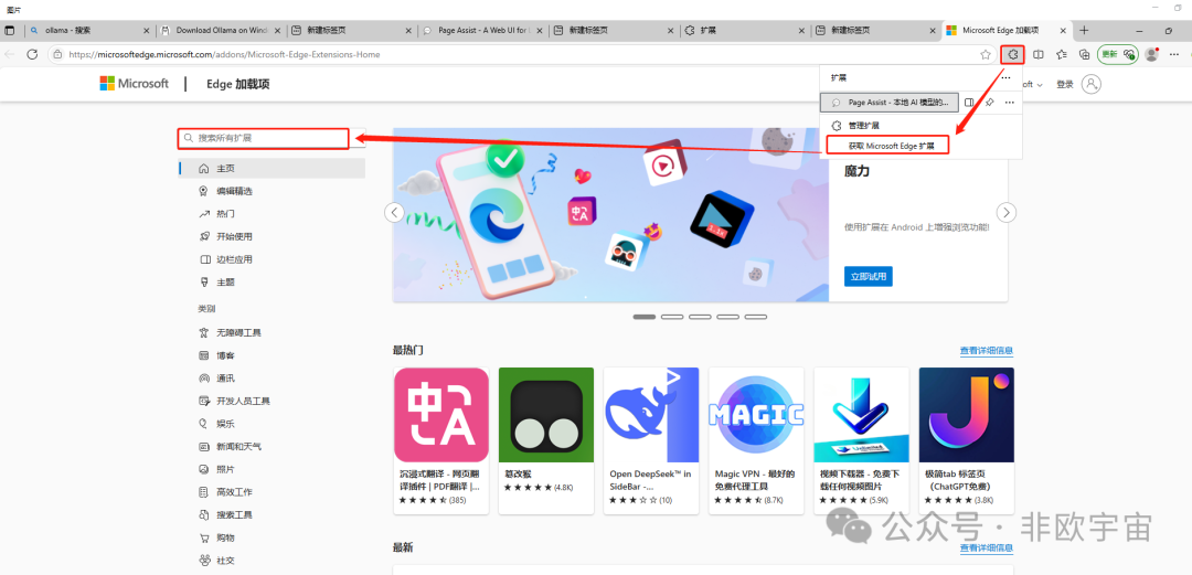 以Windows自带的Egde浏览器为例,调用本地Deepseek模型。在Egde浏览器中点击插件图标,点击“获取Microsoft Edge 扩展”,输入“Page assist”,点“获取” “Page Assist - A Web UI for Local AI Models”,