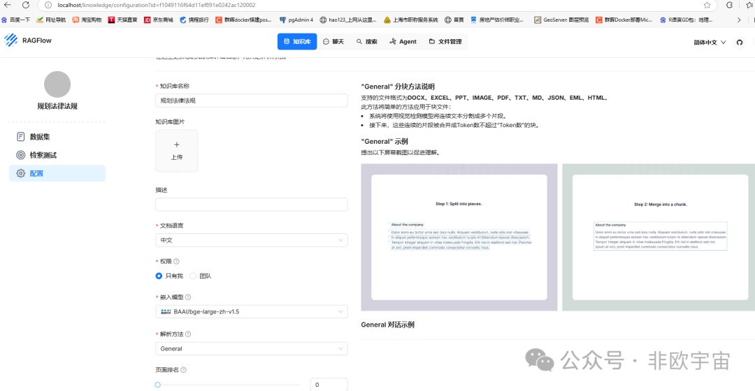 新增知识库,设置中选择文档语言“中文”或“英文”,按实际来。嵌入模型选large的,解析方法选“General”,其他的参数后续可以根据实际效果调整。