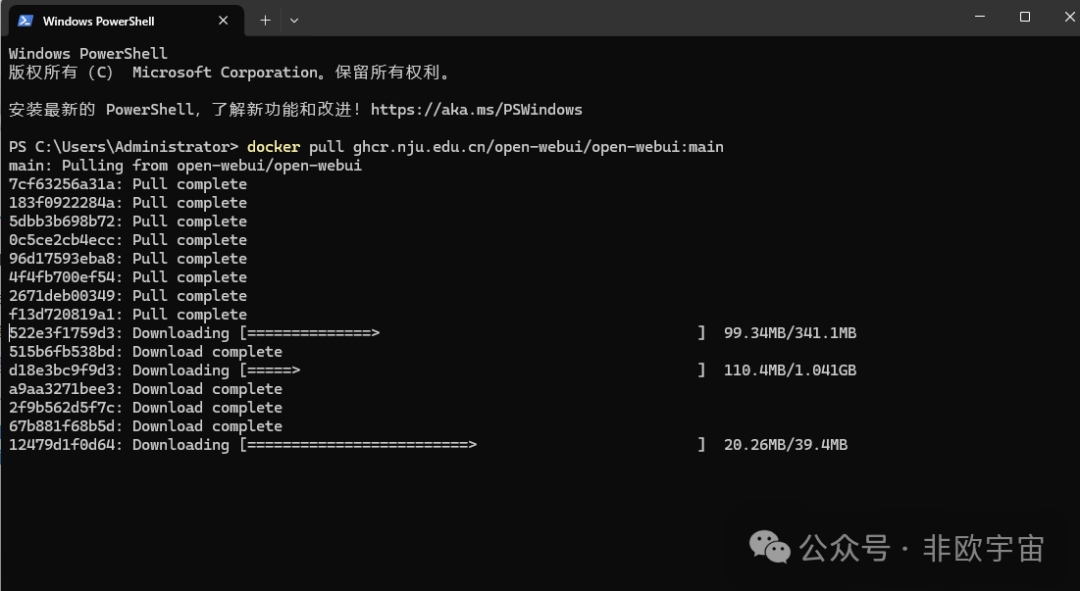 先PowerShell拉取Open-WebUI的镜像,采用国内镜像源。“docker pull ghcr.nju.edu.cn/open-webui/open-webui:main”。官方镜像为“docker pull ghcr.io/open-webui/open-webui”非常慢。