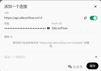硅基流动的API(支持Deepseek)如下。Prefix ID(提供商名称)为“SiliconFlow”,URL为“https://api.siliconflow.cn/v1”,密钥为“sk-***********”。这三个参数你在自己购买的API服务文档都能找到。