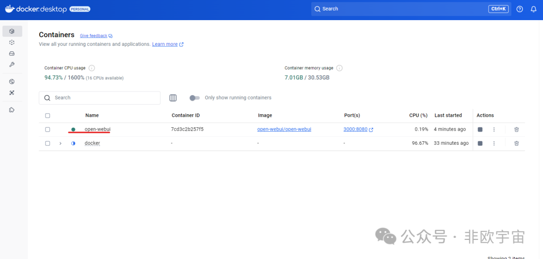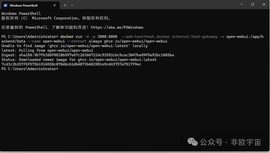 采用PowerShell命令行安装。“docker run -d -p 3000:8080 --add-host=host.docker.internal:host-gateway -v open-webui:/app/backend/data --name open-webui --restart always ghcr.nju.edu.cn/open-webui/open-webui”。