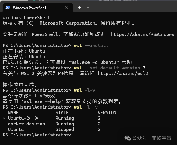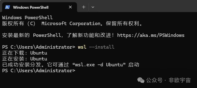 在PowerShell 中输入以下命令并执行:“wsl --install”。会自动执行安装“Ubuntu”。
