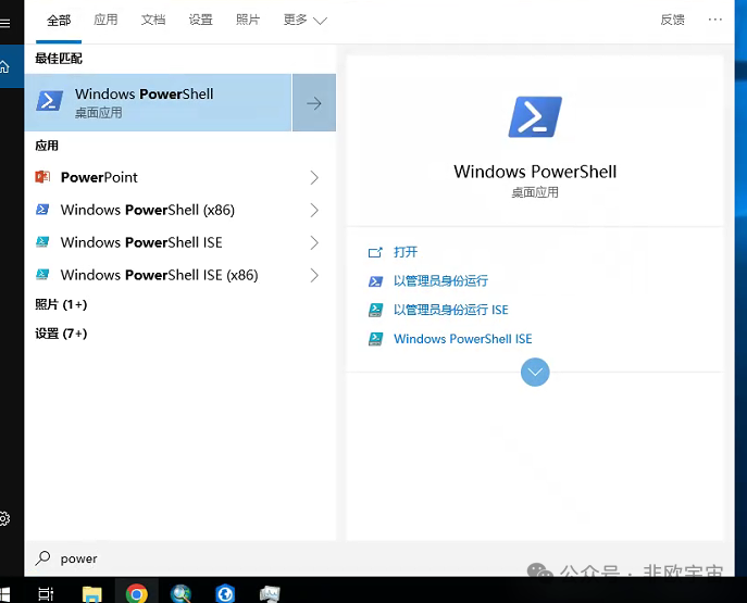 或者采用另一种方式。开始页面搜索PowerShell,以管理员身份打开PowerShell中。