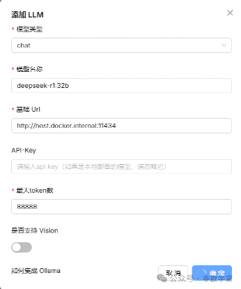 添加Ollama的“chat”模型。模型名称通过查看ollama list查看,填入已有的模型如“deepseek-r1:32b”。基础url采用“http://host.docker.internal:11434”。点击确定,可能需要配置一段时间。