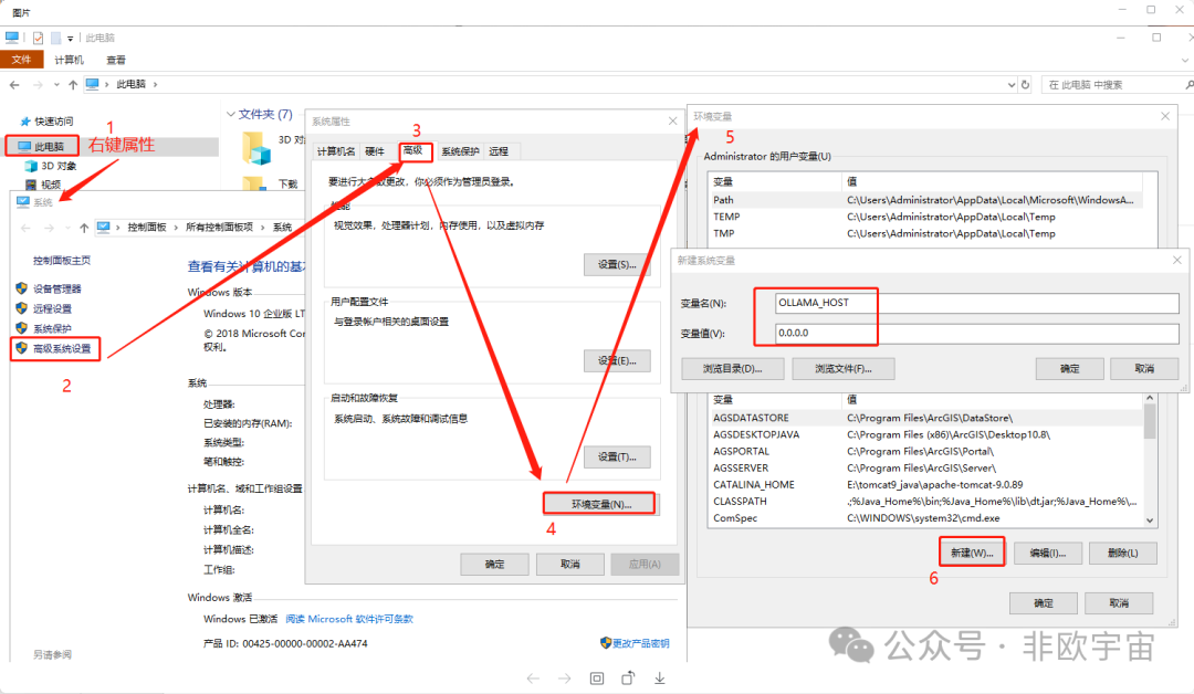 系统属性窗口中,变量名输入:“OLLAMA_HOST”, 变量值输入:“0.0.0.0”。保存后,再新建系统变量,变量名输入:“OLLAMA_ORIGINS”, 变量值输入:“*”。