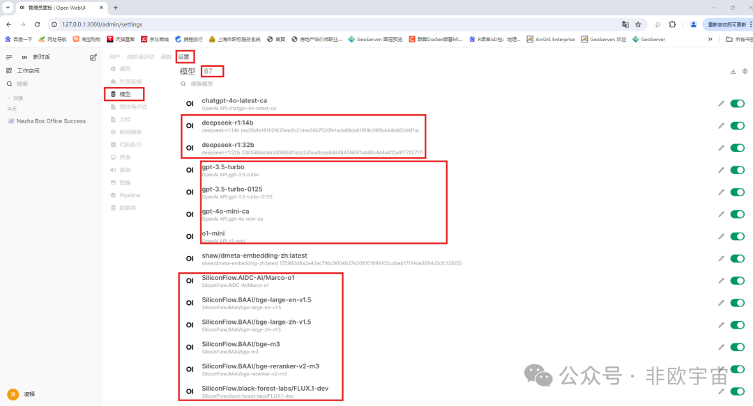 进入模型,可以看到所有支持的大模型。如下图,只是没选择硅基流动的模型,所有模型加一起有87个。最好是在上一步只添加需要的模型,不然一个个关闭太费劲了。