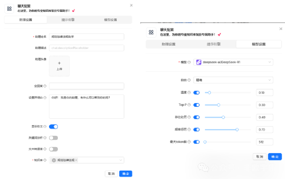 设置名称譬如“规划法律法规助手”。知识库选择“规划法律法规”。模型设置里,你可以选择使用满血的Deepseek,而不是本地部署的32b蒸馏版Deepseek模型,以获得更快的响应速度和更好的回答质量。