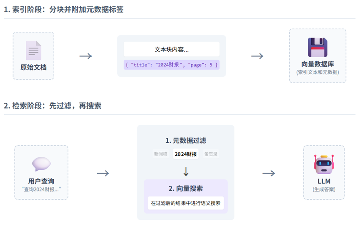 - 原理:分块时添加元数据(如页码、文档标题),检索前过滤无关块。