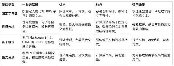 分块策略选择取决于文档类型。以下是核心方法及其适用场景(配图示增强理解):